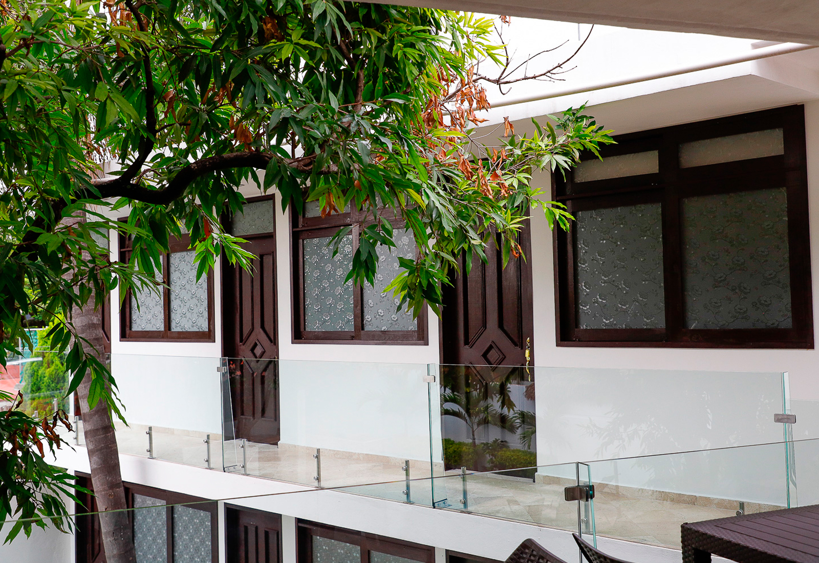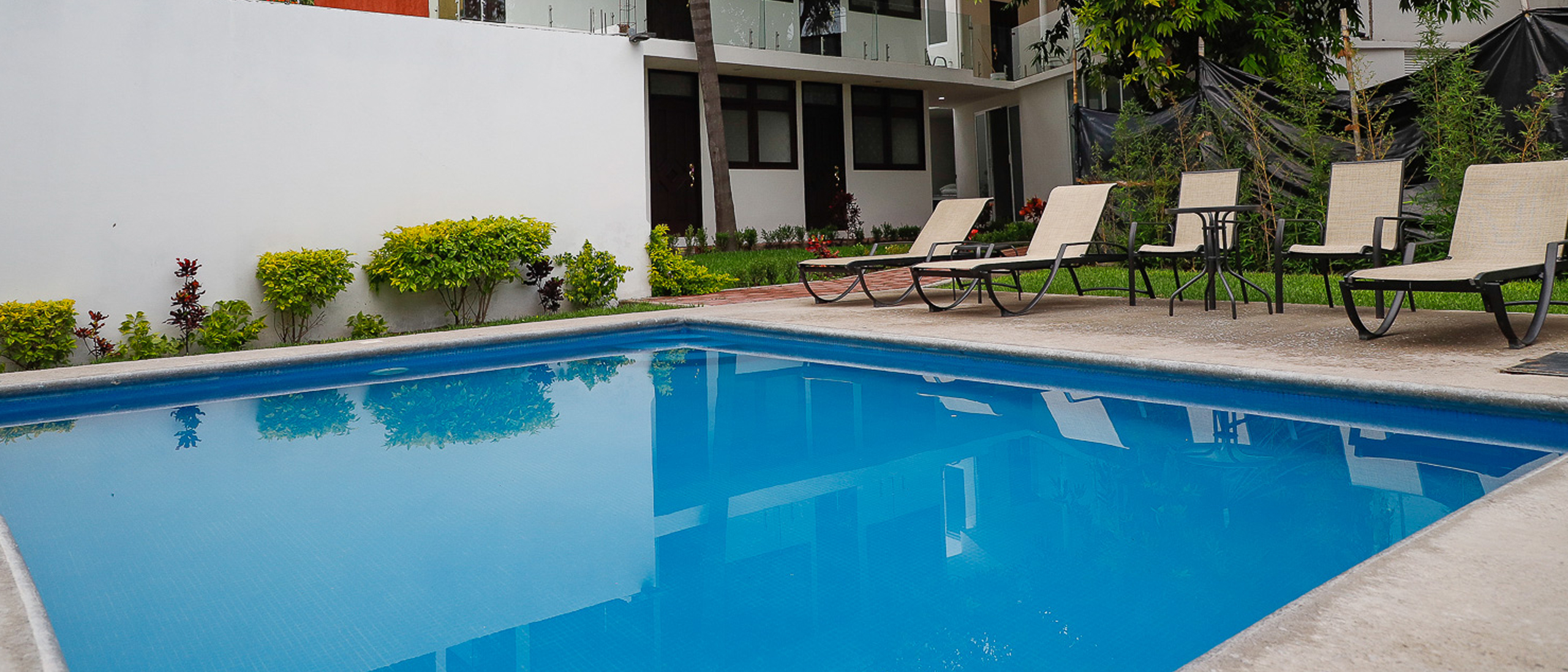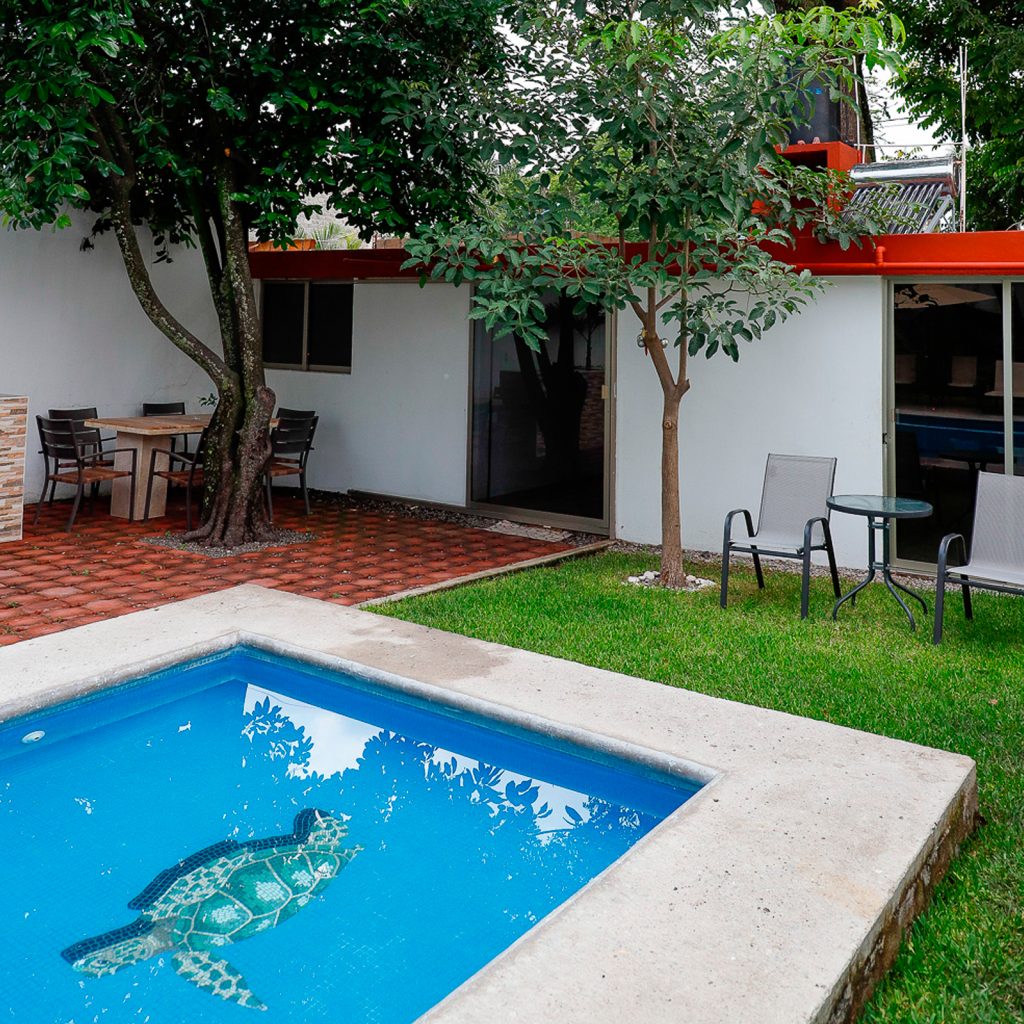 El hotel está distribuido en dos plantas. En la planta baja, además de la recepción, encontrarás la alberca y las áreas verdes.